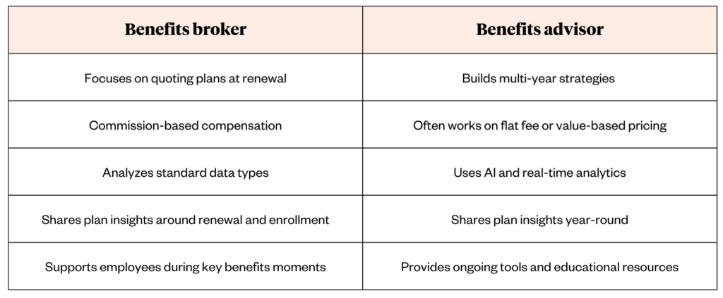 While they still help you choose plans and negotiate renewals as traditional benefits brokers do, advisors go far beyond that. They guide strategy, mitigate risk, and consistently support your employees.