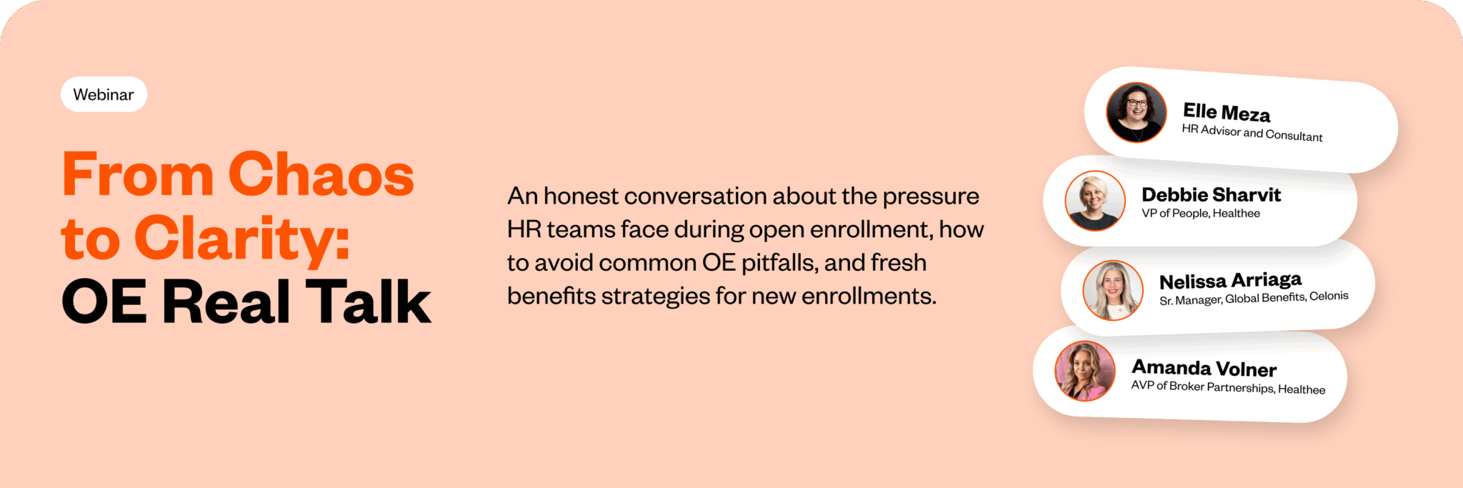 From Chaos to Clarity: Real Talk on Open Enrollment for HR Teams” is your go-to resource for strategic OE planning. Our latest webinar tackles the common challenges of OE preparations with hot tips from industry experts.Hosted by Amanda Volner, AVP of Broker Partnerships at Healthee, this panel discussion features HR experts Debbie Sharvit (VP of People at Healthee), Elle Meza (HR Advisor and Consultant), and Nelissa Arriaga (Senior Manager of Global Benefits at Celonis) sharing practical strategies for streamlining your open enrollment processes.