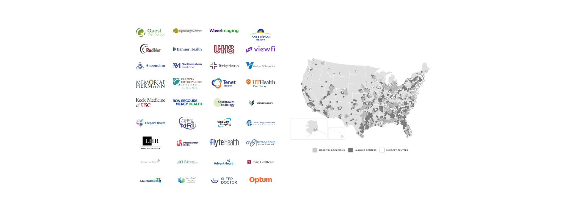 Our bundled cash network features over 10,500+ contracted providers offering 170,000 bundled procedures nationwide, including major health centers like Quest Diagnostics, RadNet, Northwestern Medicine, Ascension, UHS, Wellspan, and many more. This comprehensive network includes hospitals, ambulatory surgical centers, labs, and imaging centers — all offering transparent, upfront pricing that averages 20-50% below traditional network rates.
