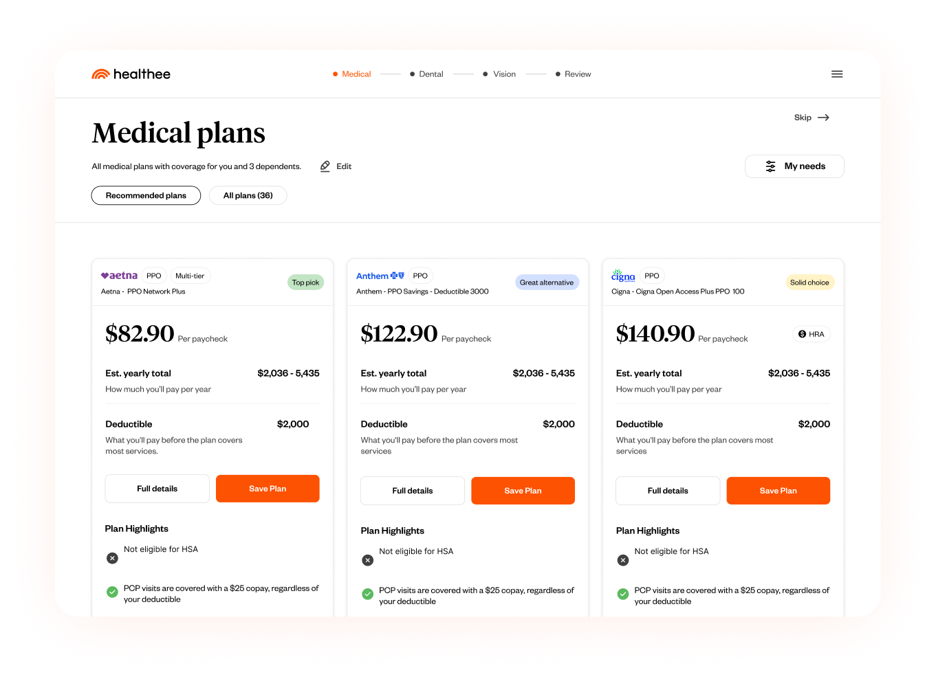 When it’s time to elect coverage, Healthee’s easy-to-use plan comparison platform helps employees evaluate and decide on the best health plans based on their family’s needs.